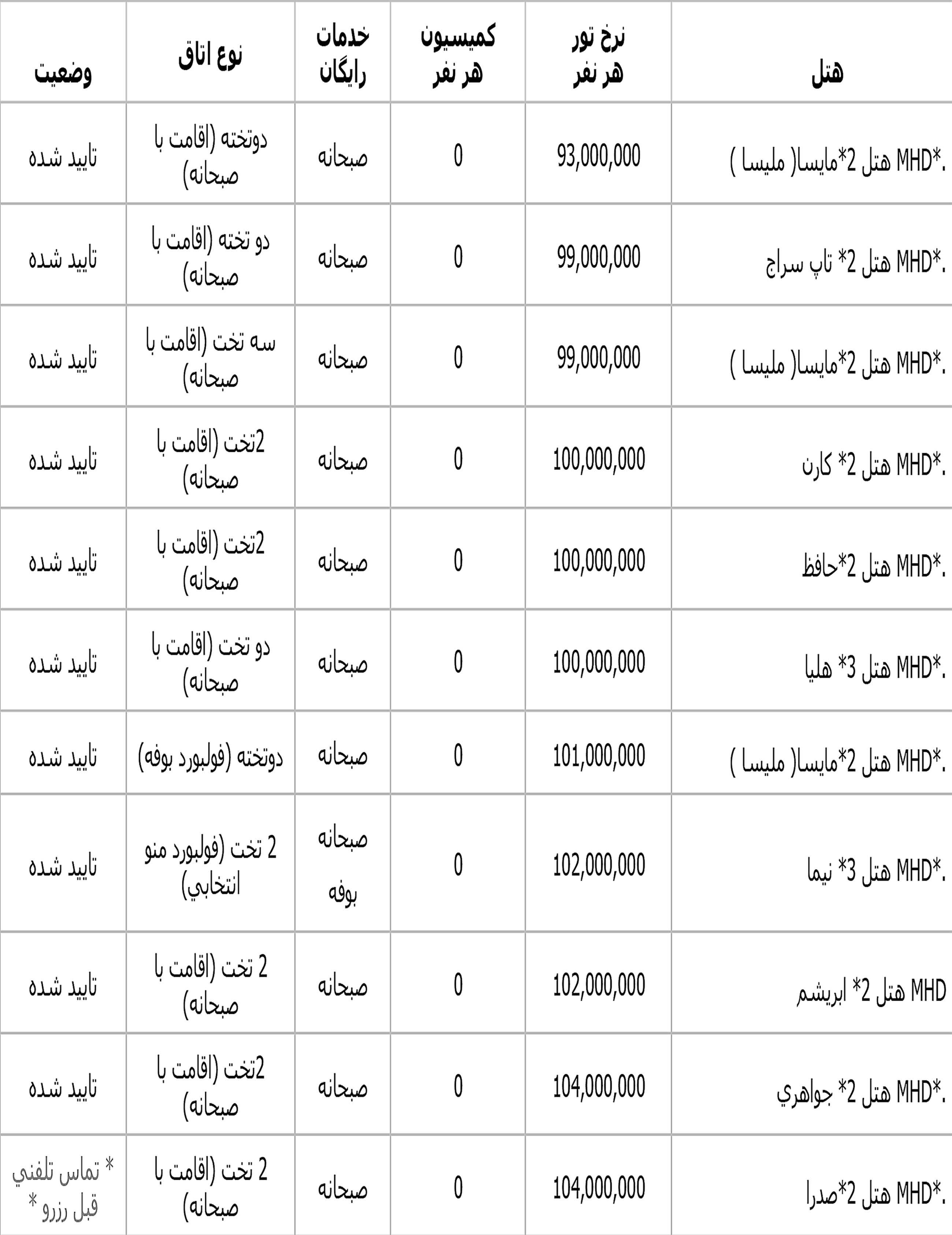 | ﻣﺴﯿﺮ | قیمت تور(ریال) | ﺗﺎرﻳﺦ | ﺳﺎﻋﺖ ﭘﺮواز | ﺳﺎﻋﺖ ورود | ﭘﺮواز | وﺿﻌﯿﺖ |